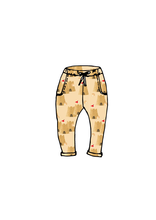 Baby pocket trousers, Oeko-tex Knit in a sandcastles fabric